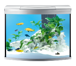 Kaarevalla etulasilla varustettu akvaario.